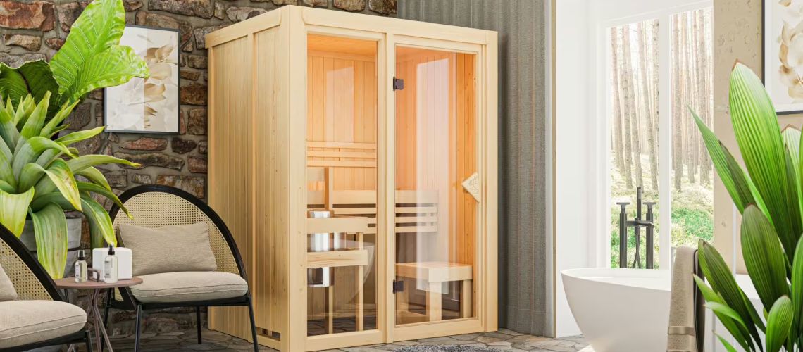 Nanja - Karibu Sauna Plug & Play ohne Ofen - ohne Dachkranz - Klarglas Ganzglastür