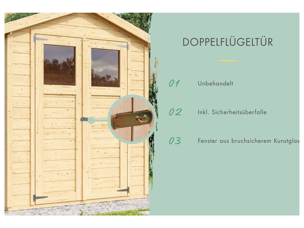 Die Doppeltür ist durch den Massivholzrahmen besonders stabil. Die Justierung geht durch die Einbohrbänder leicht von der Hand. Durch zwei Kunstglas Fenster in jedem Türflügel, scheint Licht in Ihr Gerätehaus. Durch ein Schloss kann Ihr Gerätehaus mithilfe der Sicherheitsüberfälle abgeschlossen werden.