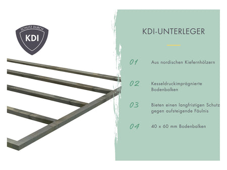 Die Unterkonstruktion ist aus kesseldruckimprägniertem Holz gefertigt. Das kdi Holz des Fundamentrahmens schützt Ihr Produkt vor Feuchtigkeit von unten. Die Querbalken werden zur Müllvermeidung zusätzlich anstelle von Paletten zum Transport der Ware verwendet. Das Bild zeigt teilweise einen Fußboden, dieser ist nicht im Lieferumfang enthalten und ist für die Dahme Serie nicht erhältlich.