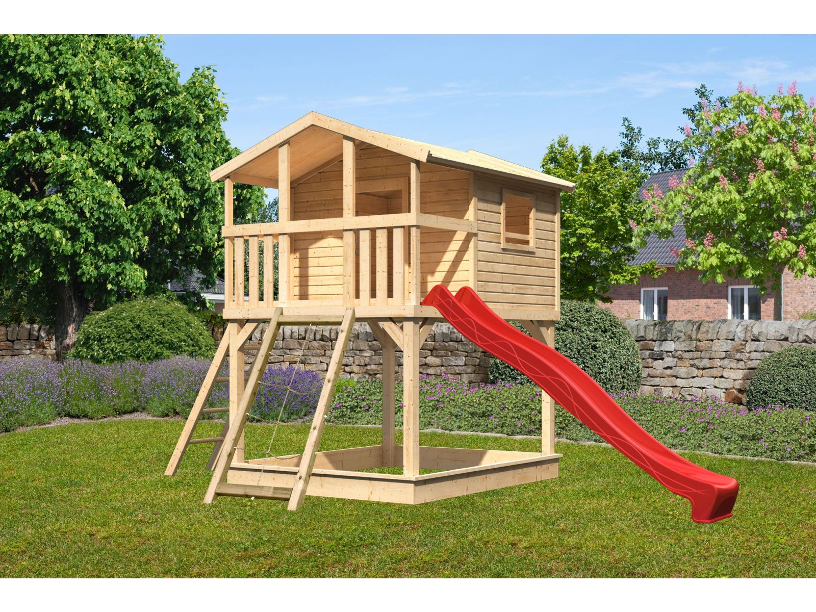 - Karibu Stelzenhaus Benjamin natur mit Netzrampe und Rutsche in rot