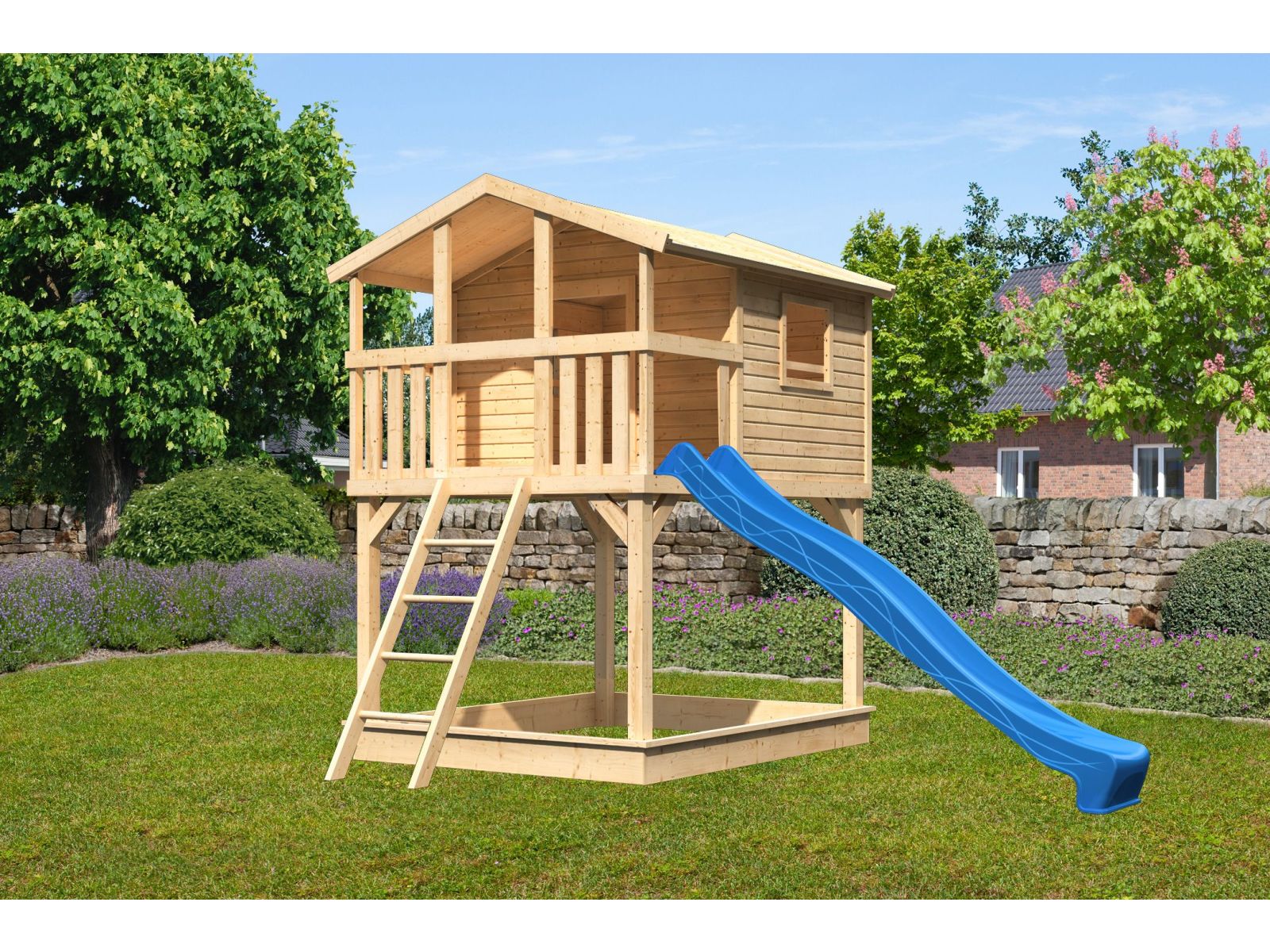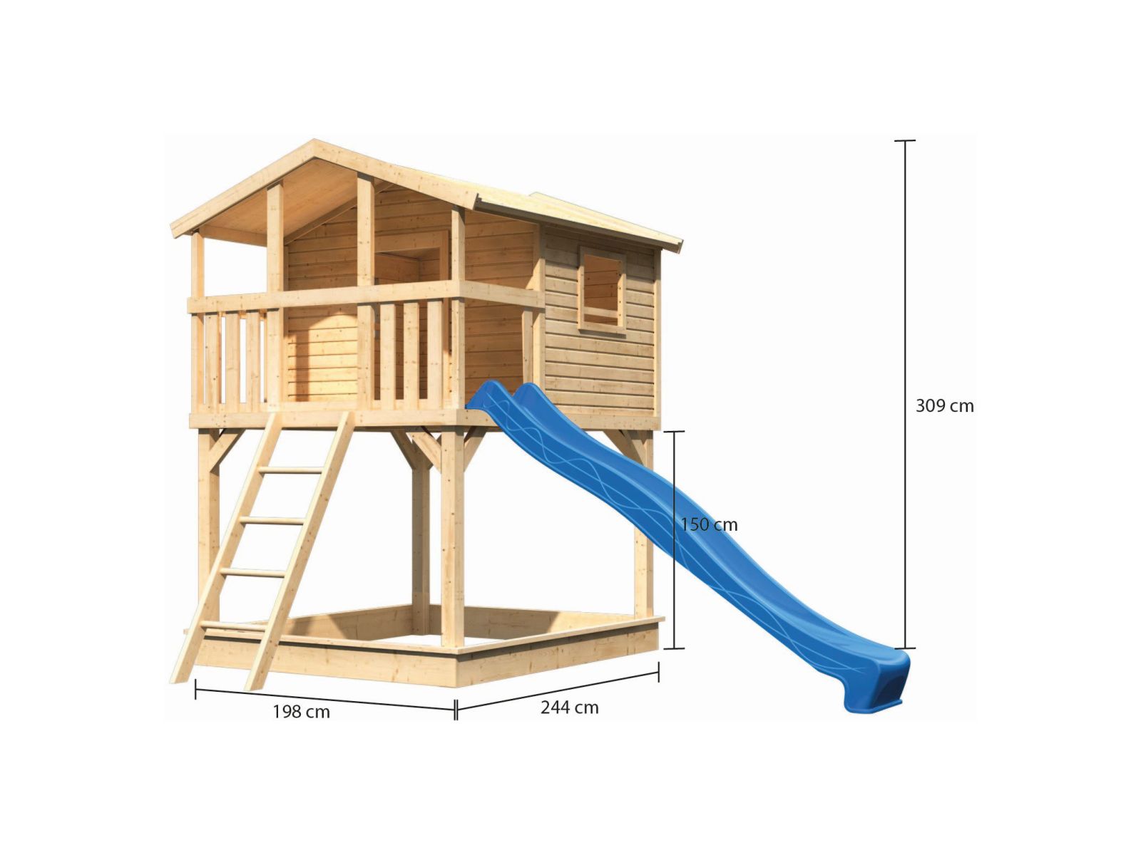 - Das Karibu Stelzenhaus Benjamin mit Terrasse besitzt ein Außenmaß von B x T 198 x 244 cm und eine Rutsche in blau
