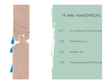 - Dacheindeckung: Satteldach aus 19 mm Massivholz