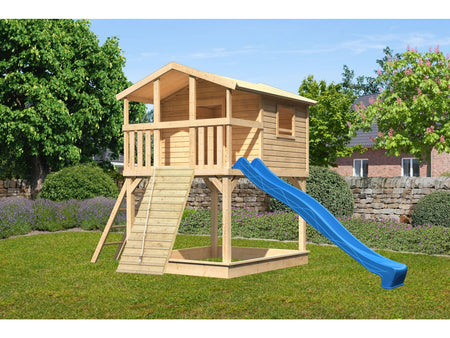Karibu Stelzenhaus Benjamin naturbelassen + Rutsche blau + Holzrampe