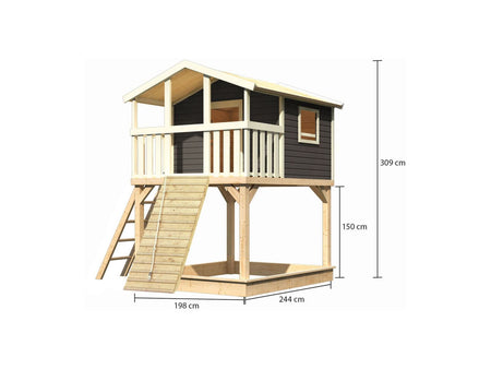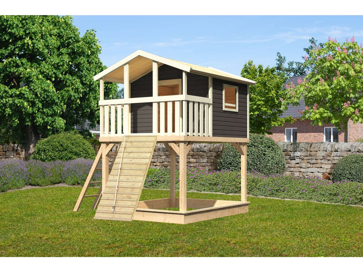Karibu Stelzenhaus Benjamin terragrau mit Holzrampe