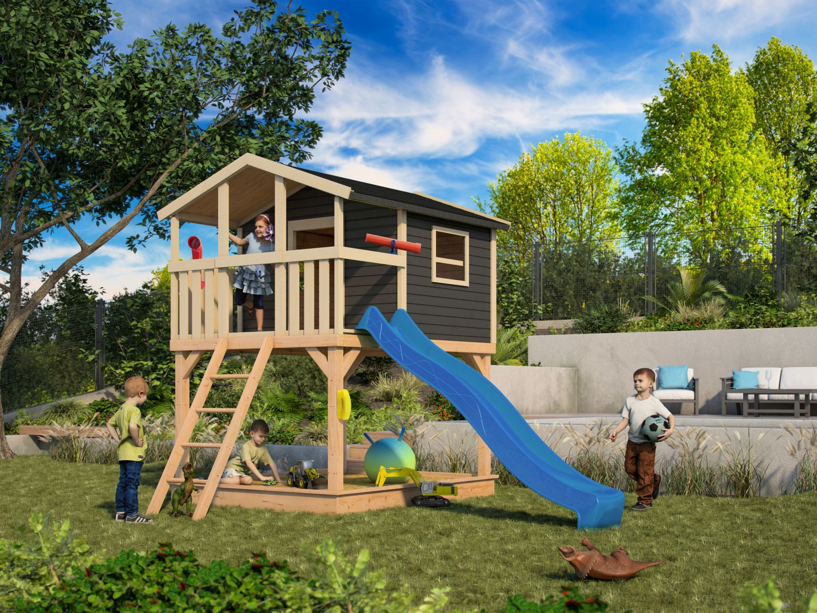 - Das Karibu Stelzenhaus Benjamin terragrau mit Terrasse besitzt ein Außenmaß von B x T 198 x 244 cm und eine Rutsche in blau